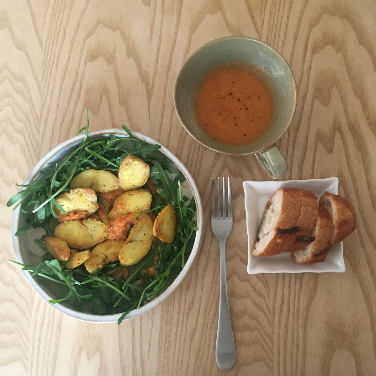 1 와일드 루꼴라를 흐르는 물에 씻어 물기를 뺀다. 닭가슴살(컬리 PB상품을 요즘 애정한다)을 먹기 좋은 사이즈로 썰어 소금, 후추, 강황가루 & 올리브 오일로 마리네이트하고 기버터를 두른 팬에 굽는다. 토마토를 끓는 물에 삶아 껍질을 벗기고 믹서에 넣어 올리브 오일, 소금, 후추, 레몬즙, 파미지아노 치즈를 갈아 넣어 믹싱 해주니 딥소스 또는 드레싱으로 딱이다. 접시에 루꼴라를 라운드로 두르고 토마토 딥을 바닥에 깔고 닭가슴살을 올린다. 딥소스 나머지는 바게트를 찍어 먹는다.