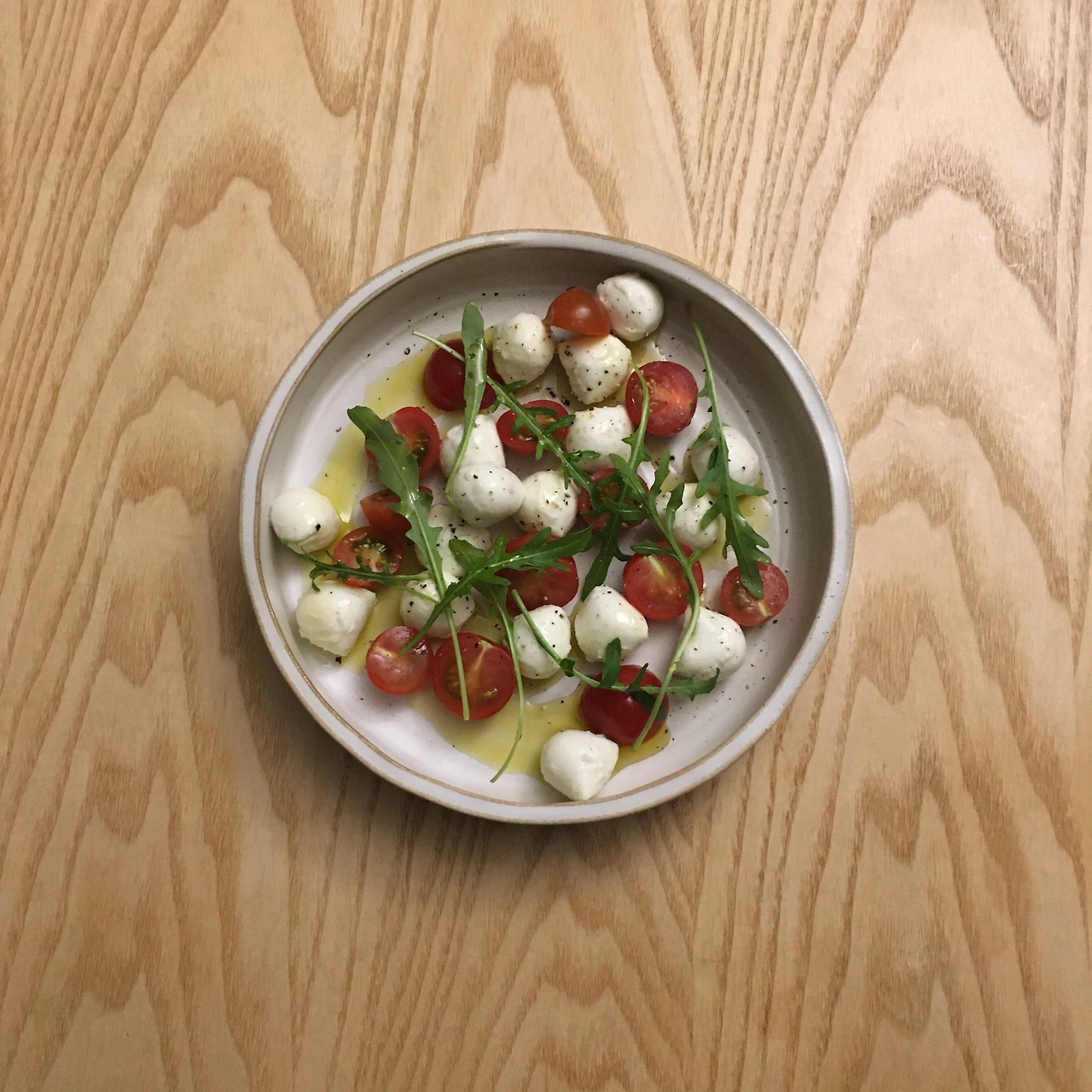 2 한 잔 더 하기 위해 뭔가 안주가 아쉬웠던 어느 날 밤. 컬리에서 구매해 두었던 보코치노 치즈를 플레이트에 담고 방울토마토를 반으로 슬라이스 하여 역시 담은 후 엑스트라 버진 올리브 오일을 듬뿍 담뿍 둘러준 후 통후추를 솔솔 흩뿌리고 와일드 루꼴라를 몇 가닥 얹었다. 칵테일과 너무 잘 어울려 다음에도 해 먹기로 결심한다.