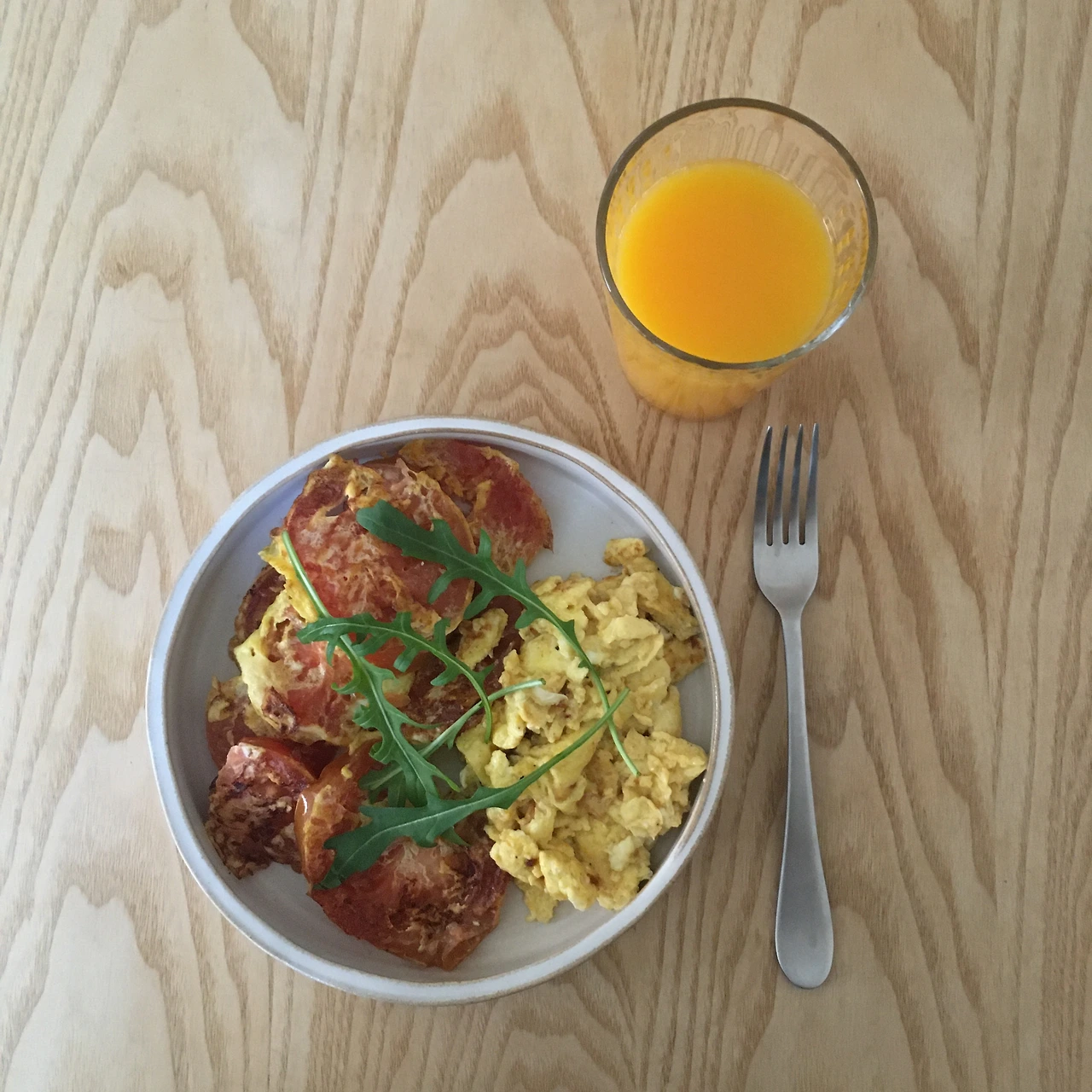 2 어느 날의 아침. 토마토를 슬라이스하고 계란물을 입힌 후 코코넛 오일을 두른 팬에 약불로 굽는다. 나머지 계란물에 소금, 후추, 파미지아노 치즈를 살짝 뿌려 스크램블드를 만든다. 와일드 루꼴라를 몇 가닥 올려 맛있게 먹는다.