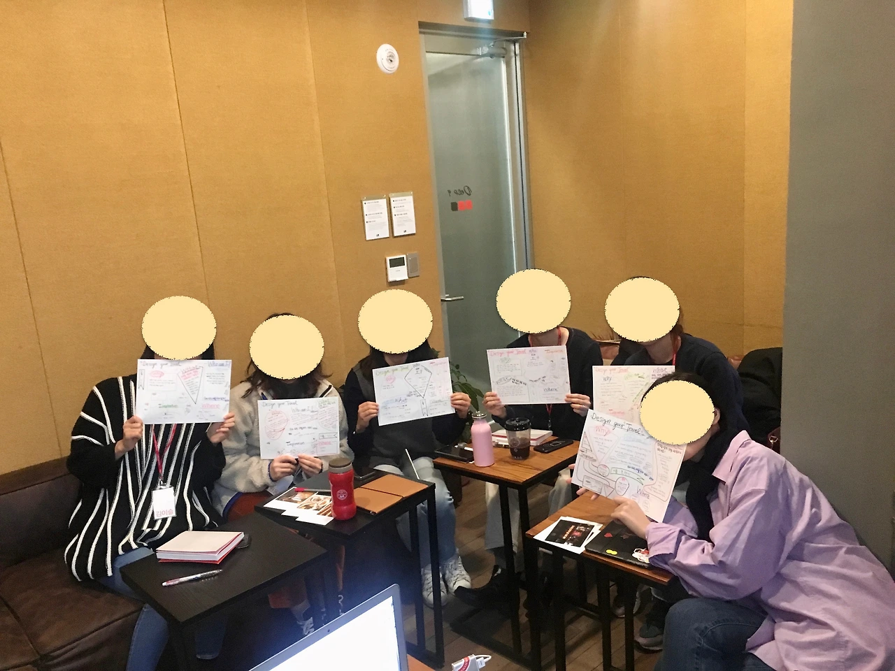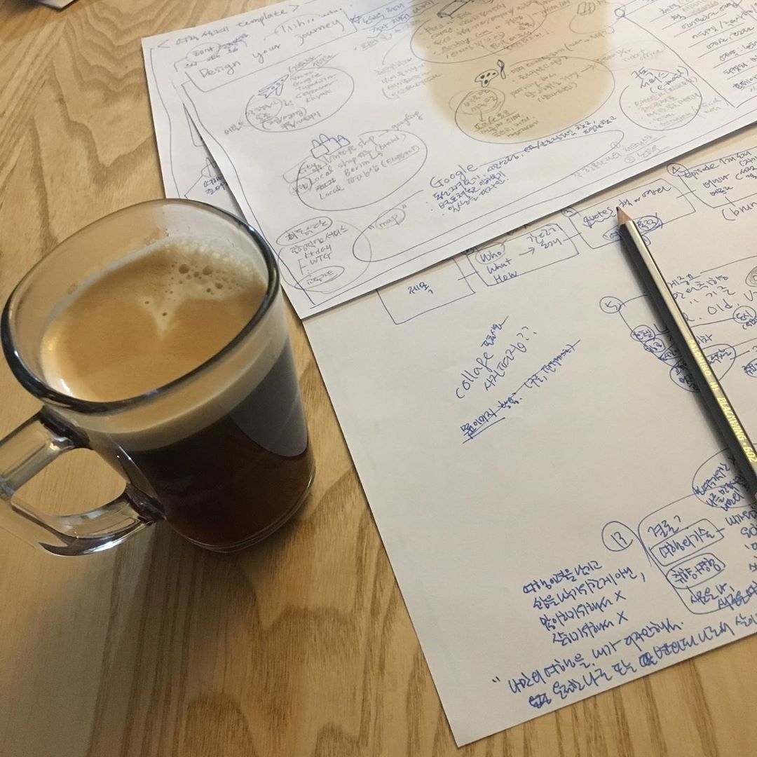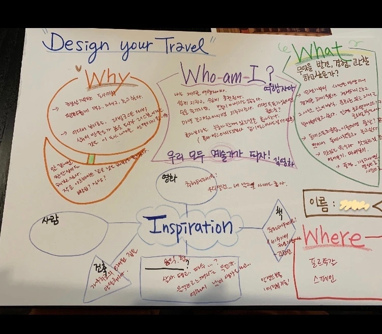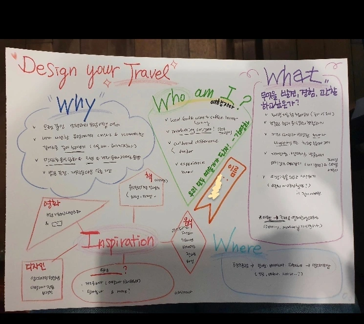 첫 만남의 피날레는 여행 디자인 템플릿 (초안) 작성하기로 계획해보았다. 이 부분에서 방법에 대한 고민이 꽤 되었던 터라 가장 많은 시간을 할애했고, 생각의 시행착오를 여러 번 거쳤다. 결국 쌓여만 가는 고민을 뒤로하고 아날로그 방식을 택했다. 멤버가 단 6명 이기에 가능했던 방식이기도 했지만 생각과 손을 동시에 쓴다는 것의 즐거움을 함께 나누고 싶었다. 종이와 색연필로 한 명 한 명을 생각하며 템플릿을 직접 그려보는 일을 과연 삶에서 언제 해볼 수 있는 일일까 싶어 매 순간을 만끽했다. 각자 시간을 갖고 직접 작성해보며 작성을 마치면 옆 자리의 멤버와 둘씩 짝을 지어 서로의 여행 디자인 초안을 소개하며 다시 이야기를 나누는 시간을 가졌다. 앞서 펼쳐졌던 열띤 대화가 더 차분하고 깊게 이어지는 모습을 바라보노라니 그대로 흘러가도록 두고 싶었다. 흘러가는 시간을 붙잡고 싶은 심정으로 활기차고 온화한 이들의 대화를 마무리하도록 권할 수밖에 없었던 그때의 그 아쉬움은 여전히 여운이 길게 남아있다. 몇몇 풍경을 소개해볼까 한다.