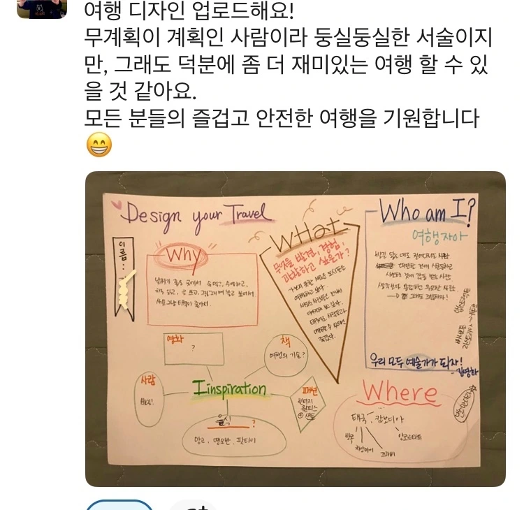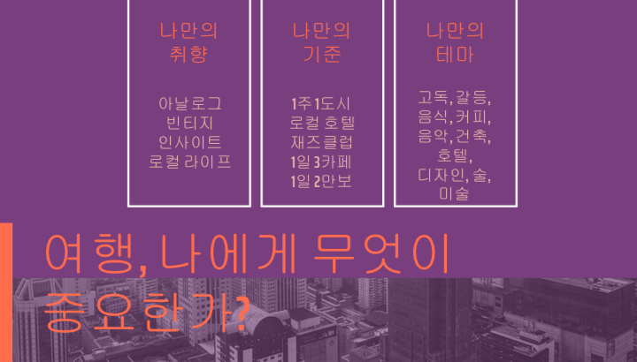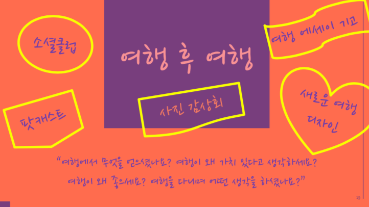 - 여행 슬로건 발견(또는 제작) 및 여행 노하우/실질적인 tip/흥미로운 아이디어 공유