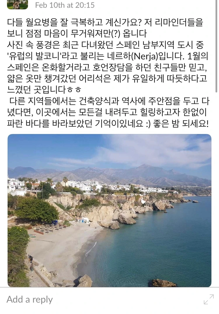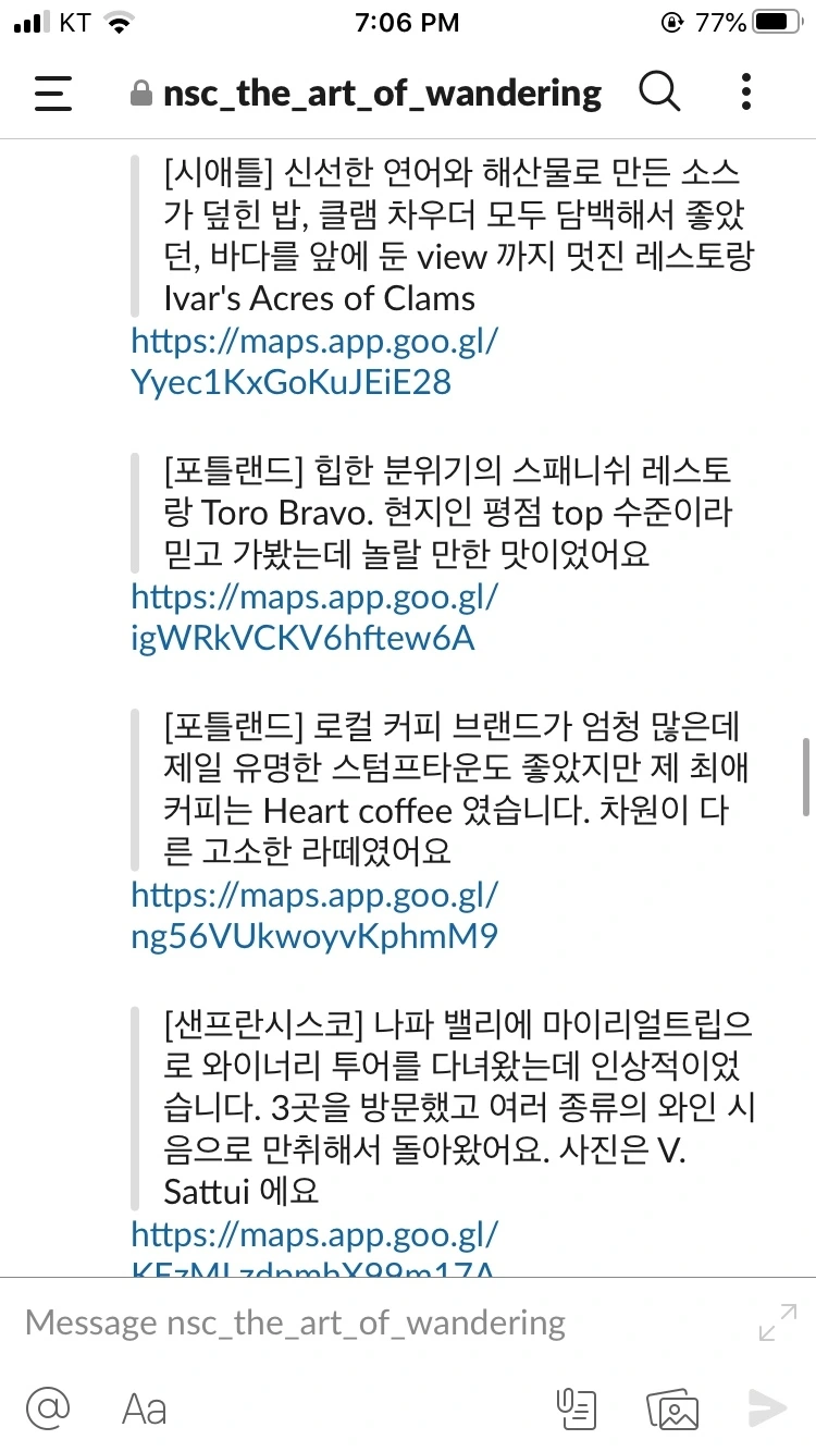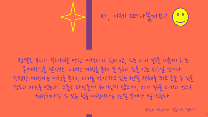 우리는 늘 변화 하기도, 늘 그대로이기도 하지 않나. 우리의 여행도 그러하지 않을까. 나만의 여행을 디자인하는 경험이 켜켜이 쌓이다 보면 그 자체로 삶의 한 역사가 되는 스토리가 쌓이는 것일 터. 그 누구의 어떤 여행도 같은 여행은 단 하나도 없을 것이다. 모두 각자의 방식으로, 자신만의 생각과 바람과 기대대로 어딘가를 그리고 무엇인가를 체험할 테니 말이다. 강렬했던 첫 만남에서의 아날로그식 여행 디자인 작업을 해본 이후 2주간 슬랙을 통해 온라인에서 만났다. 각자의 여행을 추억하며 사진을 공유하기도 하고, 스토리나 글을 공유하기도 했다. 아무래도 팬데믹 가운데 있다 보니 서로의 여행 계획을 향한 안타까운 염려와 격려의 말도 주고받기도 하고, 어떤 선입관이나 편견 없이 서로의 이전 여행 또는 앞으로 떠날 여행을 응원했다. 추천하고 싶은 여행지, 레스토랑, 카페, 서점 등의 장소나 특별했던 곳에서의 느낌과 생각 그리고 여행지에서의 독서를 위한 책 추천까지 여러 정보를 주고받으며 우연히 여행 슬로건을 발견하기도 하고, 계획에 없던 색다른 여행지에서의 여정을 그려보는 시간을 갖기도 했다.