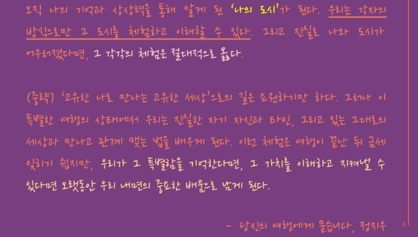 스스로에게 왜 여행하는가를 묻고, 나는 어떤 사람 인가 와 어떤 여행을 해왔고 또 꿈꾸는지 그려보는 데에 많은 영감을 받은 책 '당신의 여행에게 묻습니다(정지우)'의 일부를 발췌해 멤버들과 함께 나눴다. 우리 각자 나만의 여행에서의 그 '특별함'을 기억하며 내면에 남기자고 격려하는 시간을 가진 셈이었다. 멤버들에게 일독을 추천한 책이기도 하다.