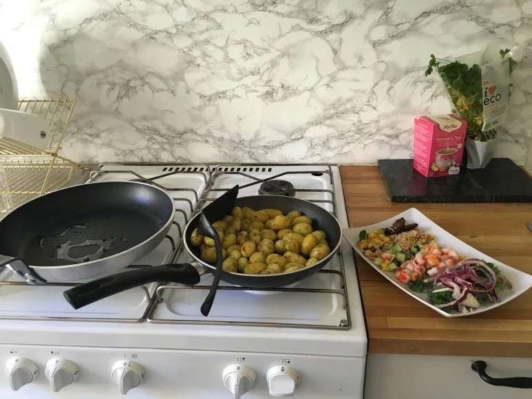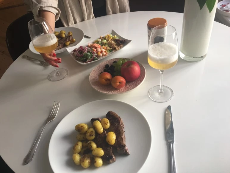 드디어 시작된 우리들의 런치 타임! 이름은 기억나지 않지만 꽤 맛있었던 로컬 맥주와 큼직한 스테이크. 그리고 감자와 과일과 샐러드! 아, 정말이지 좋은 추억으로 남는 식사. 다음 유럽 여행에서도 꼭 직접 준비한 식사를 해야지, 라고 다짐했다. 즐거움 한가득, 에어비앤비의 카피라이팅이 정말 실감나는 순간이었다. "그래, 여행은 살아보는거야!"