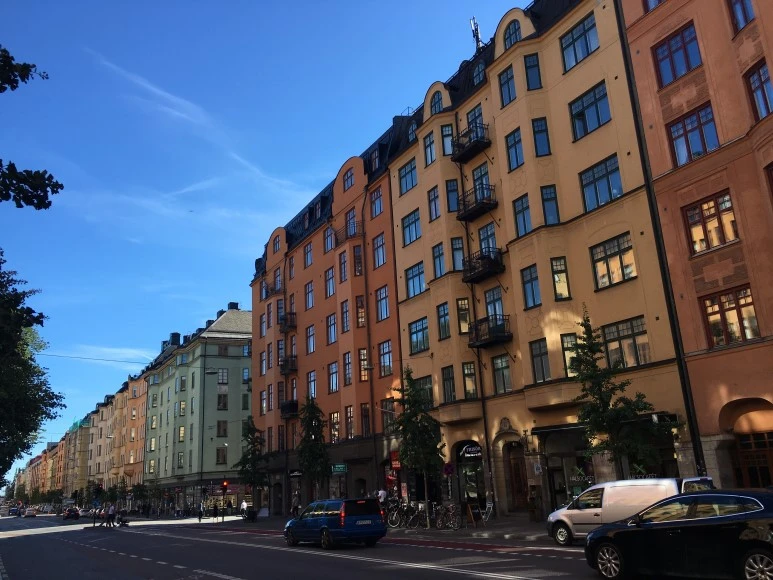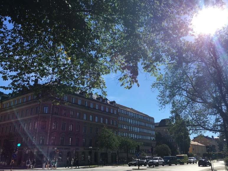 햇살이 내리쬐는 아름다운 낮의 정경. 햇살도 푸르름도 건물도 모두가 정겹다. 또 다른 매력이 깃들어 있는 새로 만난 동네, Hornsgatan(호른스가탄).