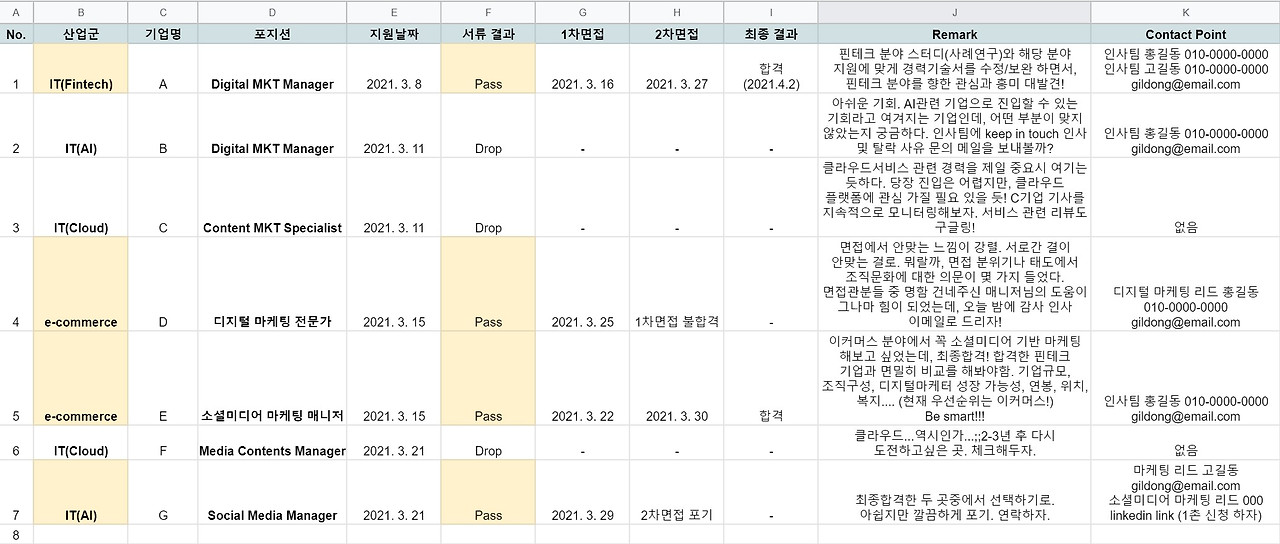 나만의 이직 '시즌'에는 이직을 기록해둘 필요가 있습니다. 한눈에 이직 현황을 살펴보는 거죠. WHY? 혹시 발생할 수 있는 커뮤니케이션 혼선을 미연에 방지하고, 효과적인 일정 조율을 위해서지요. 아울러, 어디에 어떠한 이유로 지원했고 어떤 결과가 있는지를 기록하면서 관심 분야를 재발견하고, 이직 목표를 재정립해봄은 물론 결과 모니터링 및 메모를 통해 전략을 검토하고 다시 짤 수 있기 때문이기도 하고요. 추후 네트워킹에 도움이 될 만한 컨택 포인트를 기록해둘 수도 있고, 지원한 기업과 나 사이의 스토리텔링의 소재가 될 수도 있지요. 지속적으로 관심을 두고 있는 기업이 있다면 재도전은 필수지요. 재지원을 위해 일정을 체크하는 데에도 기록은 큰 도움이 됩니다.