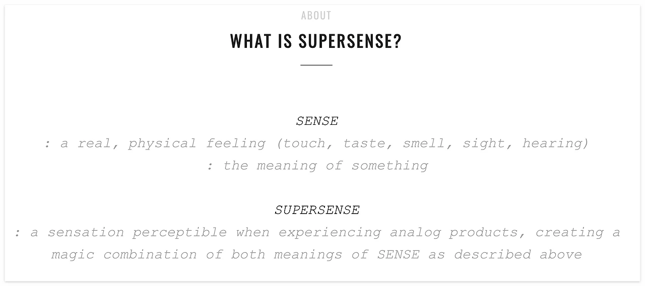 수퍼센스가 정의하는 Sense와 Supersense의 의미는 아래와 같은데요. 제게는 꽤 특별하게 다가왔습니다. Sense(감각)는 실제적이고 물리적인 느낌(촉각, 미각, 후각, 시각, 청각)이자 무언가의 의미. 수퍼센스는 아날로그 제품을 체험하면서 인식 가능한 감각으로, '감각'의 두 가지 의미를 마법 같은 조합으로 창조하는 것. 수퍼센스의 정의 및 그 의미가 물리적 공간으로 구현돼 있었습니다. 이 의미야말로 '경험 및 감각의 확장으로 일과 삶을 더 향유하고 충만하게 살아가자'는, 제가 추구하는 일과 삶(여행)의 모습과 가장 닮아있다는 것을 발견했던 것이죠. 그렇게, 거부할 수 없는 시작을 하게 되었습니다.