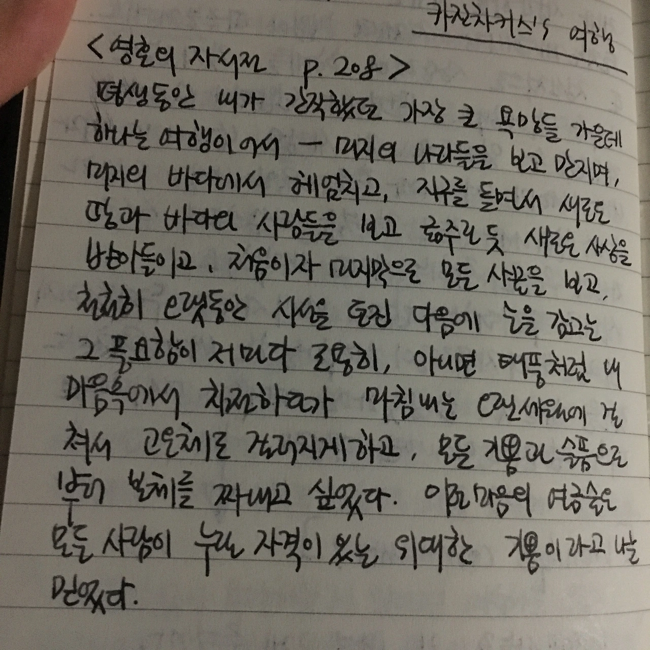 여행은 당췌 숨길 수 없는 내 안의 큰 욕망이자, 가장 충만하게 느껴지는 큰 기쁨이다. 짧지 않은 시간 동안 그 잠간의 여행을 위해 준비하는 과정은 무척 즐겁고, 직접 먼 나라 어디엔가에 다달아 낯설게 서성이며 이런저런 생각을 하는 건 짜릿하다. 철저히 이방인이 되어 거닐고 노니는 것이 내게는 되려 편안하기까지하니 여행이 적성에 맞음에 틀림없다.