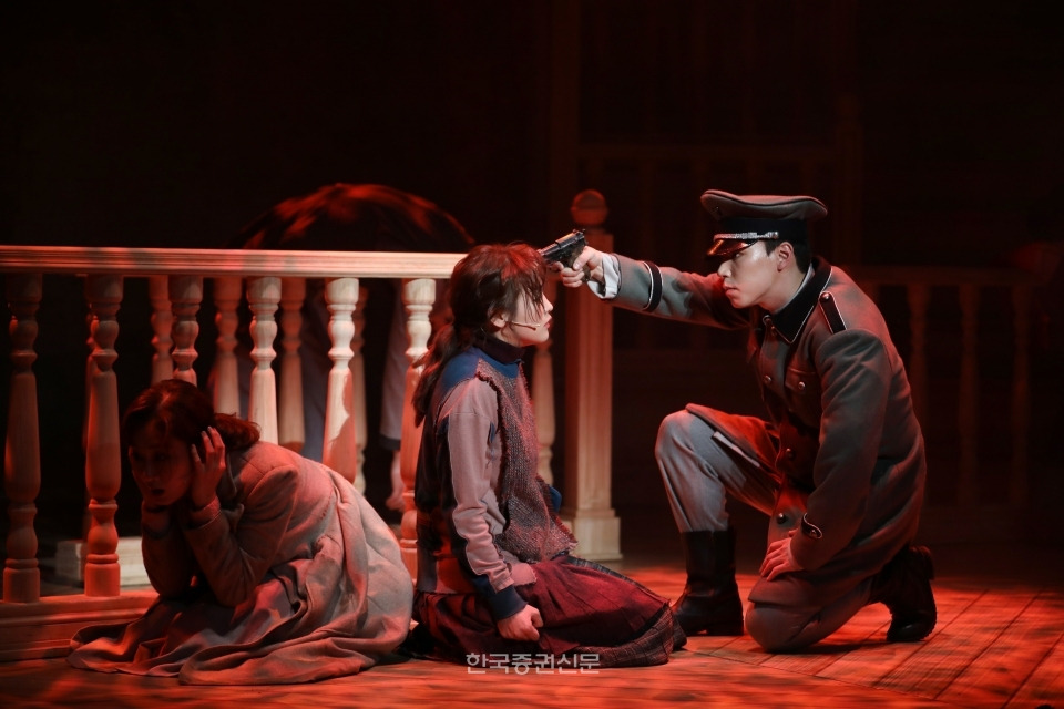 조명은 관객과 배우가 시선으로 마주치는 접점을 만들어낸다. “노동이 너희를 자유케 하리라” 넘버에서 비극으로 물든 붉은 조명은 분위기에 긴장감을 더하고, 빠르게 넘어가는 조명은 억압 속에서 목숨을 보장 받을 수 없는 이들의 두려움을 드러낸다. 어린 호프는 자신을 향하는 총구 앞에서 생존을 위해 비밀리에 모의됐던 유태인의 저항 운동을 털어놓는다. 이 장면에서, 관객은 조명을 통해 끔찍한 광경을 더욱 극적으로 목도한다.