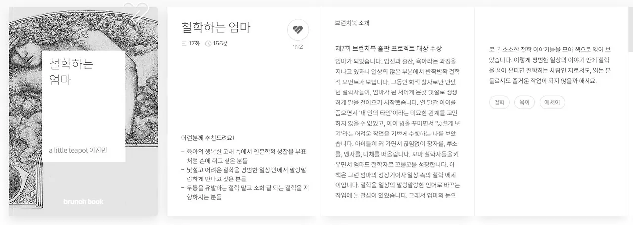 그래서 철학을 말랑말랑한 일상의 언어로 바꾸는 그런 작업에 늘 관심이 있었어요. 제가 철학하는 사람으로서는 턱없이 부족하지만, 배운 것을 좀 말랑하게 풀어내는 건 할 수 있지 않을까 해서요. 브런치에 연재하는 <철학하는 엄마>는 그런 마음에서 나왔어요. 임신과 출산, 육아라는 과정을 지나면서 일상의 많은 부분에서 반짝반짝 철학적 모먼트가 보이거든요. 이런 평범한 일상의 이야기 안에 철학을 끌어 온다면 철학하는 사람인 저로서도, 읽는 분들로서도 즐거운 작업이 되지 않을까 해서요.