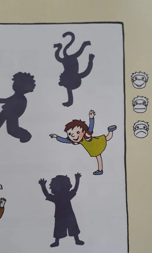 첫 번째에 관해서는 뭐든지 아이들의 의견을 듣는 게 기본으로 시스템 안에 잘 깔려있는 것 같아요. 아이가 이제 5살이 되어 초등 예비반을 시작했는데요. (이듬해에 학교에 갈 나이의 유치원 아이들이 학교에 잘 적응할 수 있도록 일주일에 1-2 시간 초등학교에 가서 시간을 보내요.) 아이가 숙제를 한 페이지 하더라도 페이지마다 꼭 자기가 판단하는 칸이 있어요. 이건 쉬웠다, 이건 조금 시간이 걸렸다, 이건 도움이 필요했다, 이렇게 스스로 판단하는. (아래 사진의 원숭이를 참조하세요. 숙제를 하고 나서 스스로 평가하는 란이랍니다.)