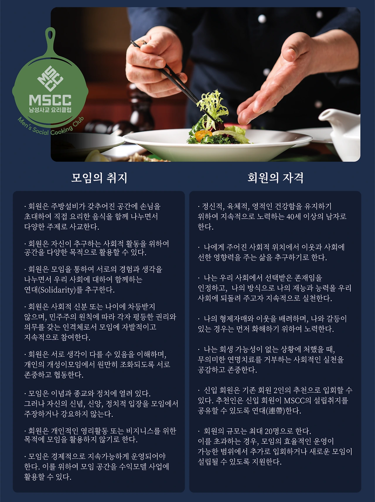 이런 목표와 가치를 회원들이 공유하면서 자신이 직접 요리하여 만든 음식으로 이웃과 친구와 선배와 후배와 스승과 제자와 임직원과 동료와 가족과 회원과 함께 나눌 수 있으면 얼마나 좋을까!