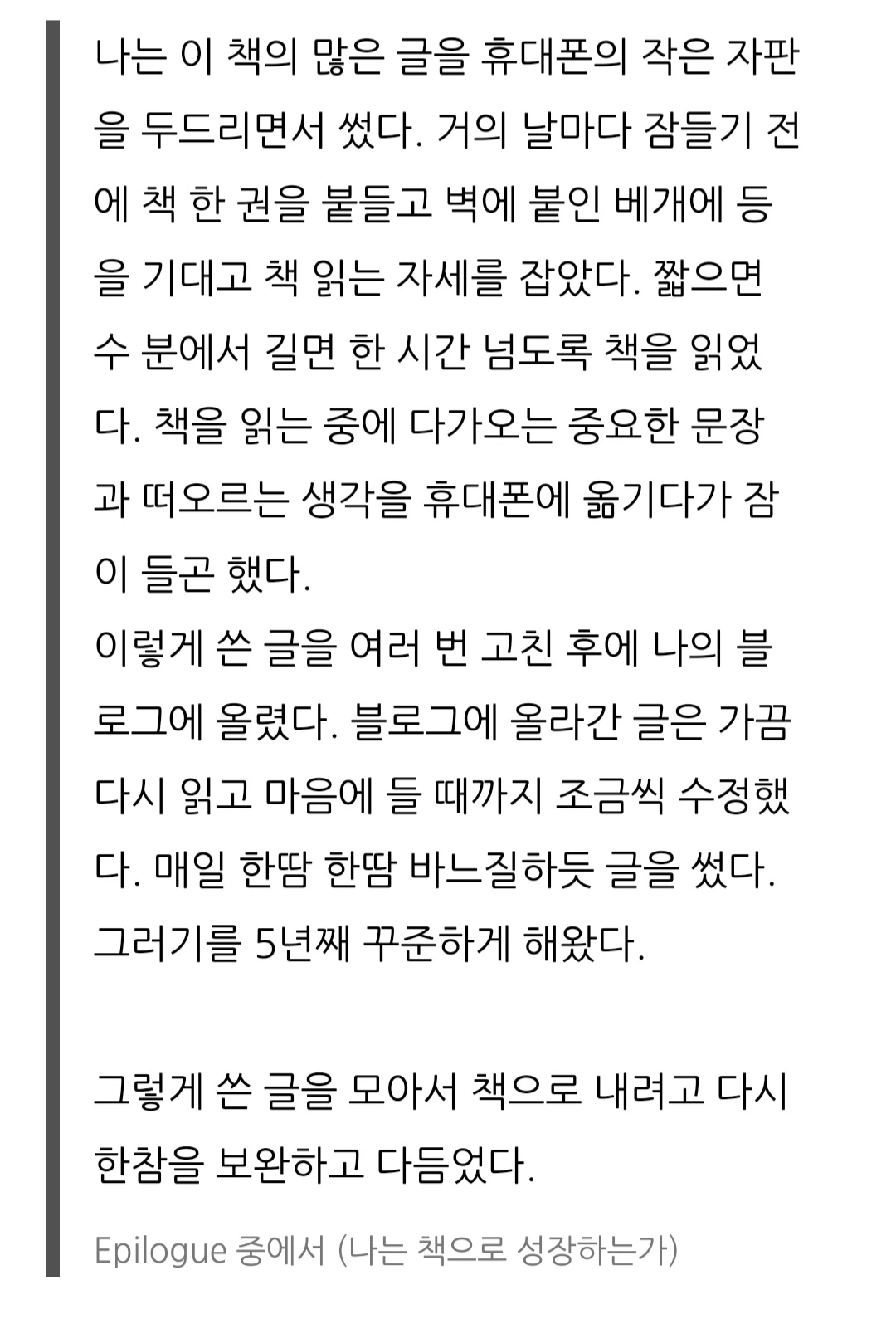 여러 채널로 선택한 다양한 책을 꾸준히 읽고 있습니다. 책 내용에서 중요하다고 느낀 부분에 나의 살아온 경험에 비춘 생각을 함께 담은 글을 지인들과 공유합니다.