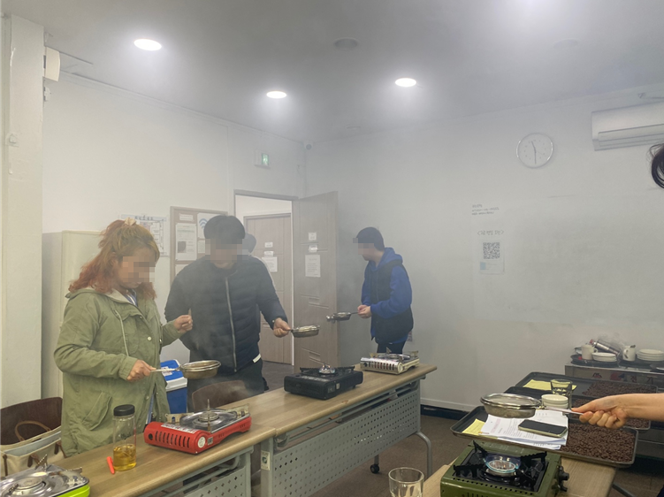 우린 머리부터 발끝까지 연기에 쩔었고, 더 이상 숨쉬기도 힘들겠다 싶을 때쯤 둘러 보니 선생님은 교실에 없었다. 잠시 복도로 나왔는데, 그 와중에도 교실에서 열심히 콩을 볶는 분도 계셨다. 열정 수강생....