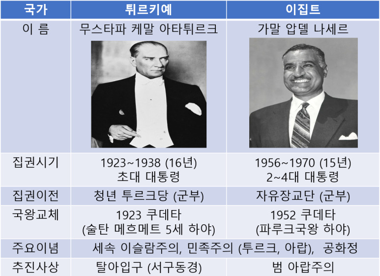 튀르키예와 이집트의 현대 공화정의 실세인 케말 아타튀르크와 가말 압델 나세르를 비교해 보겠습니다.