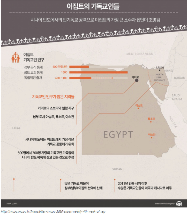 이집트 인구의 10% 정도가 콥틱 정교회 기독교인들이며, 정치적으로 협력과 탄압을 번갈아 가면서 영향력을 행사하고 있습니다.