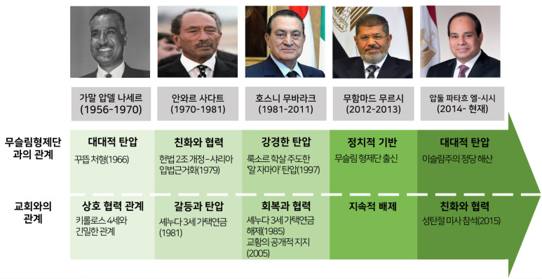 하기에 보시는 것과 같이, 각 정부에 따라서 적절하게 무슬림형제단과 교회와의 협력과 탄압을 통해 자신들의 입지를 강화하는데 활용하고 있습니다. 군부는 기본적으로 세속주의 이념 때문에 무슬림형제단을 탄압하지만, 사다트 대통령만이 유일하게 협력 관계에 있었습니다. (자신의 포용력을 보여주려는 의도)