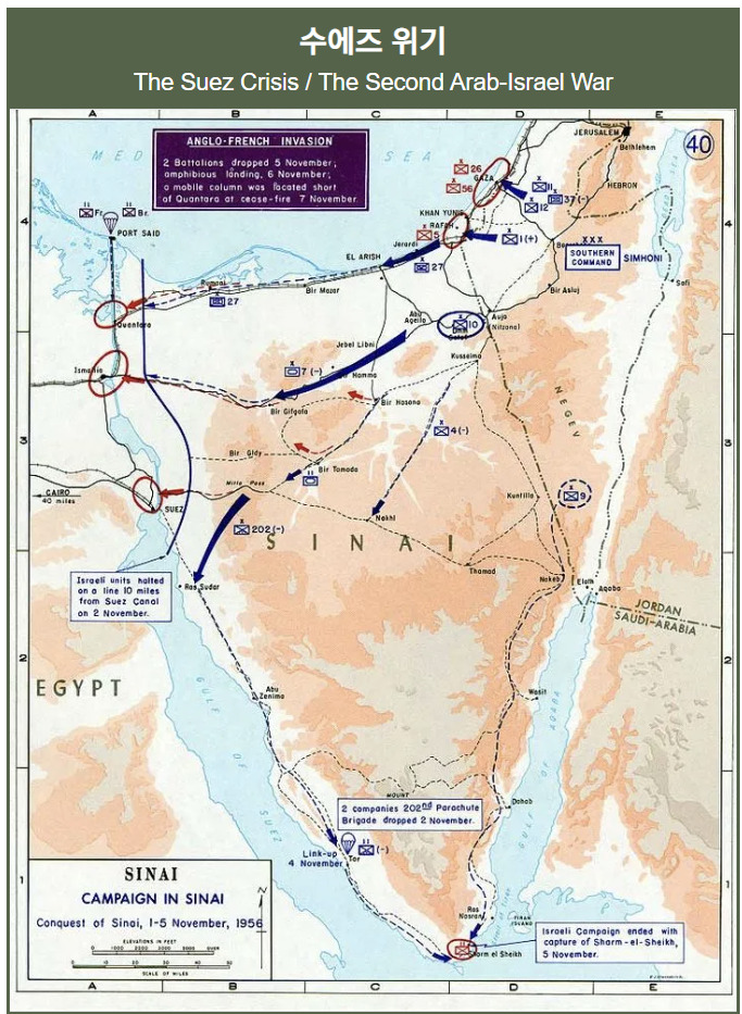 위에서 설명드린 대로 나세르 대통령이 취임하여 수에즈 운하를 국유화하면서, 영국과 프랑스는 반발하게 되고, 이스라엘도 1차 중동전쟁 후 자신들의 선박이 수에즈 운하 통과를 금지당하게 됩니다.