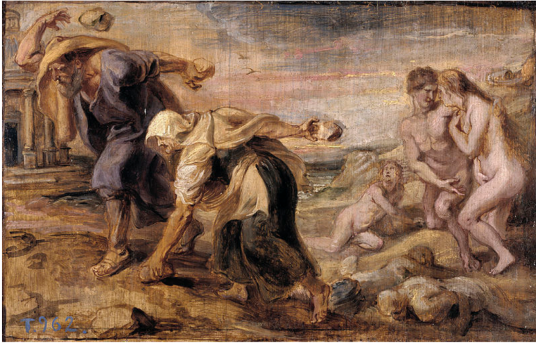 인간의 사악한 본성에 분개한 제우스가 인류를 대홍수로 멸망시키려 했을 때, 아버지인 프로메테우스의 조언을 들은 데우칼리온은 방주를 만들어 아내와 생필품을 싣고 9일 밤낮을 떠돌다 포키스의 파르나소스 산에 도착하게 되었습니다. 이 부부는 살아남은 것에 감사하며 제우스 신에게 감사의 제사를 지내면서 앞으로 생존의 방법을 신에게 물어보니, "어머니의 뼈를 등 뒤로 던져라" 라는 답이 왔습니다. 여신인 어머니를 죽이라는 의미로 알고 어리둥절하는 아내 피라를 보면서, 데우칼리온은 어머니는 "대지"를 뜻하고, 뼈는 "바위"를 말하는 것으로 해석을 합니다. 이윽고 근처에 있던 바위들을 등 뒤로 던지자 돌들이 인간이 되면서 인류가 다시 번성하게 되었다는 신화입니다. 노아의 방주 이야기와 여러 가지로 유사한 신화로 볼 수 있겠습니다.