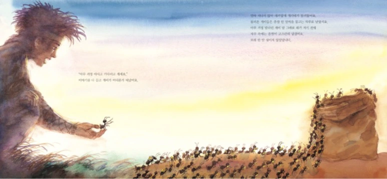 이윽고 목도령 일행은 산의 정상에 도착하게 되고, 그곳에서 한 노파와 수양딸을 만나는데, 목도령은 그 수양딸과 결혼하기를 청했습니다. 이에 노파가 그를 몇 가지로 시험하게 되는데, 모래밭에서 곡식을 가려내는 시험을 개미 떼가 도와주어 통과하고, 여러 방에 딸을 숨기고 찾아내는 과제는 모기떼의 도움을 받아 통과하여 결국 수양딸과 결혼하게 되었습니다. 이후 이 두 쌍이 자식을 낳아 인류의 새로운 시조가 된다는 신화입니다.
