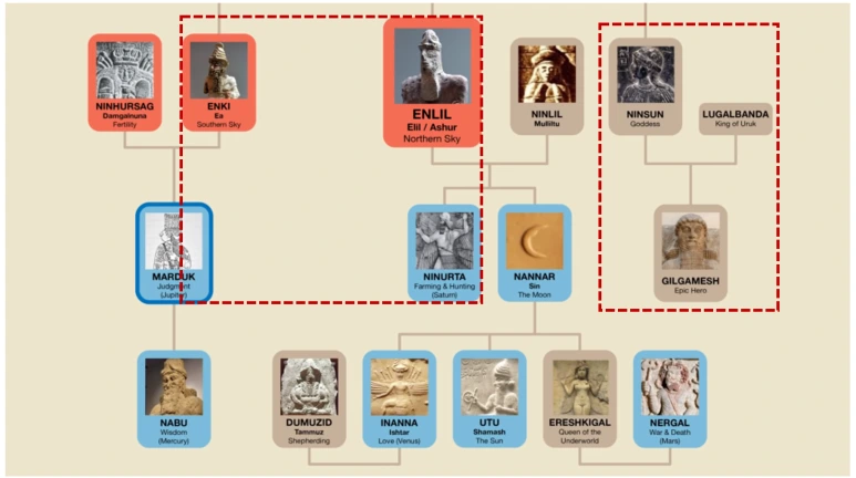 ※ 이해를 돕기 위해 하기와 같이 수메르 신들의 계보를 붙였습니다. 신의 아버지 아누(안) 밑으로 적자. 엔릴과 서자 엔키가 보입니다. 아울러 우측에 루갈반다왕과 닌순 여신사이에 태에난 길가메쉬도 박스로 표기했습니다. 결국 이신들이 나중에 그리스/로마 신화, 이집트 신화의 원형이 되게 됩니다. 다음에 포스팅할 길가메쉬 서사시에 등장하는 신들이니 참고하시기 바랍니다.