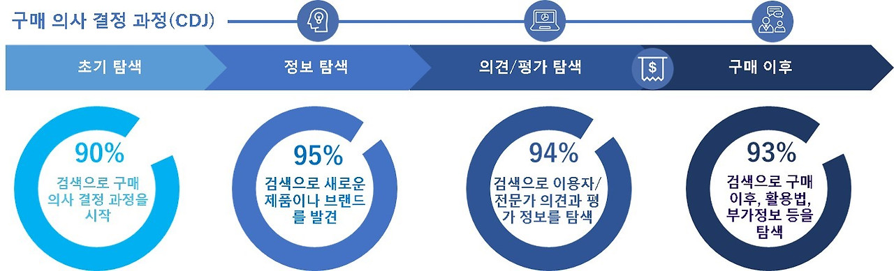 우리 모두가 경험하고 있지만, 디지털 시대, 고객의 구매 의사결정 시 10명 중 9명은 검색으로 구매의 여정을 시작한다. 그리고 당연한 얘기지만, 먼저 나오는 페이지에 더 눈이 많이 간다. B2B도 예외는 아니다. 대표가 회사복지에 필요한 커피 머신 구매 요청을 지시했을 때, 구매팀 담당자가 바로 하는 일은 검색창에 ‘기업용 커피 머신’부터 시작한다. 또한 제품들을 비교하고 관련한 리뷰들을 찾아볼 때 참조하는 채널 역시 검색이 94%에 육박한다.