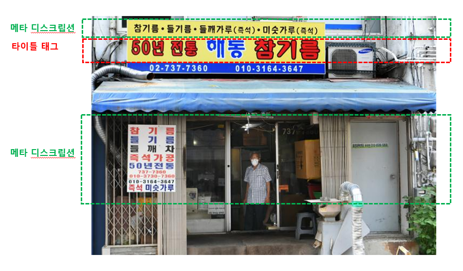 좀 더 쉽게 길거리에서 우리가 흔히 보는 참기름집(아래)에 비유해 보면 “50년 전통 해동참기름”은 타이틀 태그가 되고 “참기름, 들기름, 들깨가루, 미숫가루, 50년 전통”등은 메타 디스크립션의 역할을 한다.