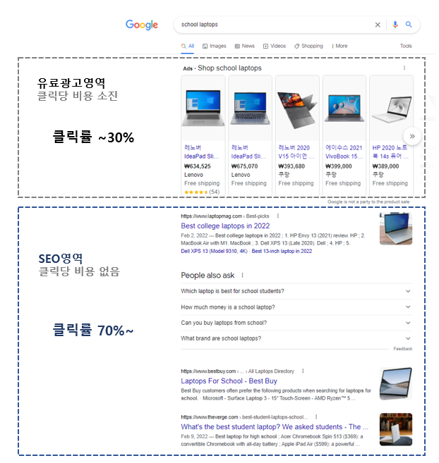 특히 네이버를 보면 파워블로거나 유튜버, 인스타 프로모션 등을 이용해 흥행몰이를 하는 회사들이 많은데 그건 SEO 최적화가 아닌 유입을 늘리는 마케팅일 뿐이고 방문자는 일시 증가하더라도 체류시간은 뚝 떨어질 것이다. 그렇게 급하면 차라리 그 돈으로 검색 키워드 광고를 하라고 권유하고 싶다.