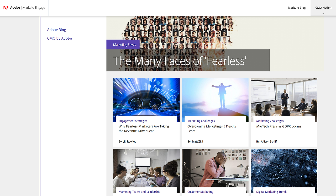 2018년, 마케팅 자동화 솔루션 업체인’ 마케토’를 인수한 어도비는 유명 현업 CMO(Chief Marketing Officer)들의 글을 큐레이션한 cmo.marketo.com이라는 블로그를 운영중이다.
