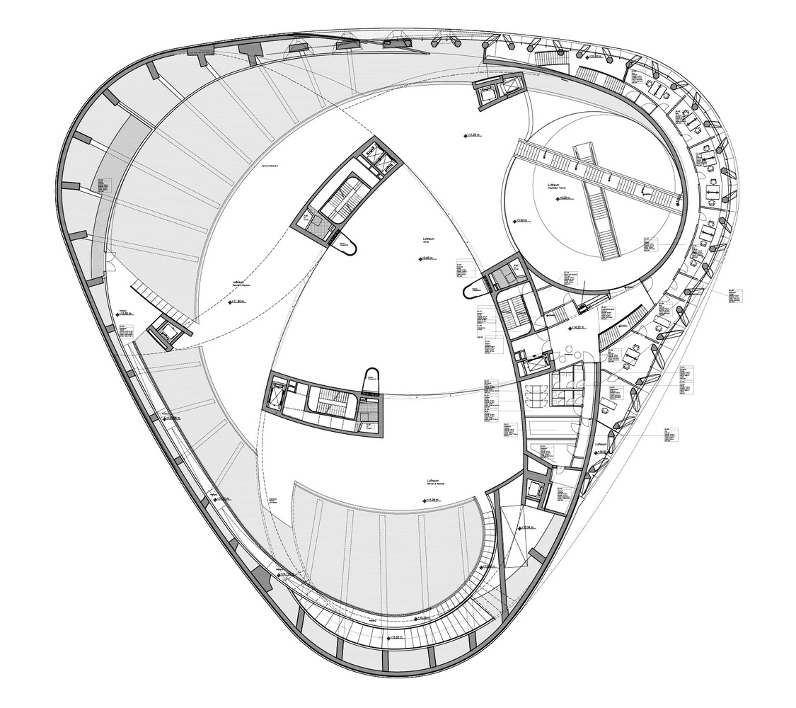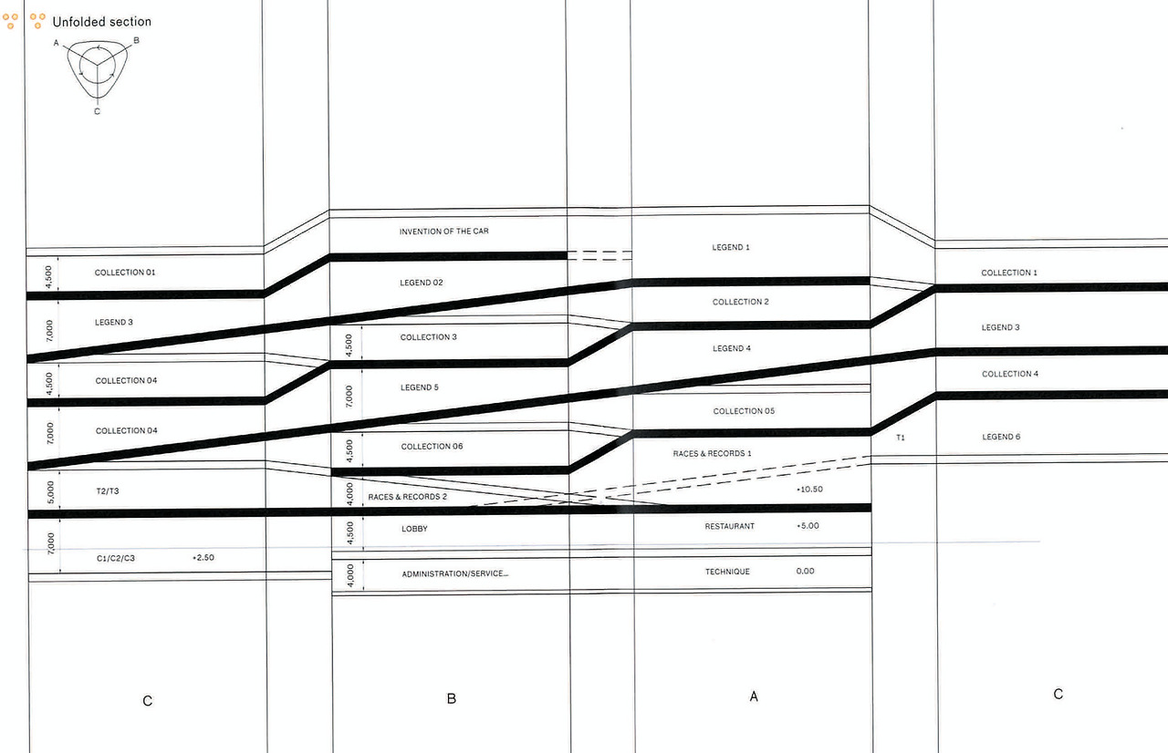 이런 부분은 구조적인 설계가 큰 역할을 하는데, 메르세데스는 공간과 공간, 층과 층을 연결함에 있어 2중 나선구조로 설계하여 관람객이 수평방향의 이동과 동시에 수직방향의 높이도 변화되면서 상하의 다양한 뷰에서 전시물을 바라볼 수 있도록 개방형으로 설계되어 있다. 그리고 계단이 아닌 ramp로 공간과 공간을 이어 주변을 자연스럽게 산책하듯 조망할수 있게 길을 만들고 또한 공간별 성격에 따라 조명을 달리해 필요한 곳에서는 자연 채광을 최대한 살려 눈의 피로를 줄이는배려심도 보인다.