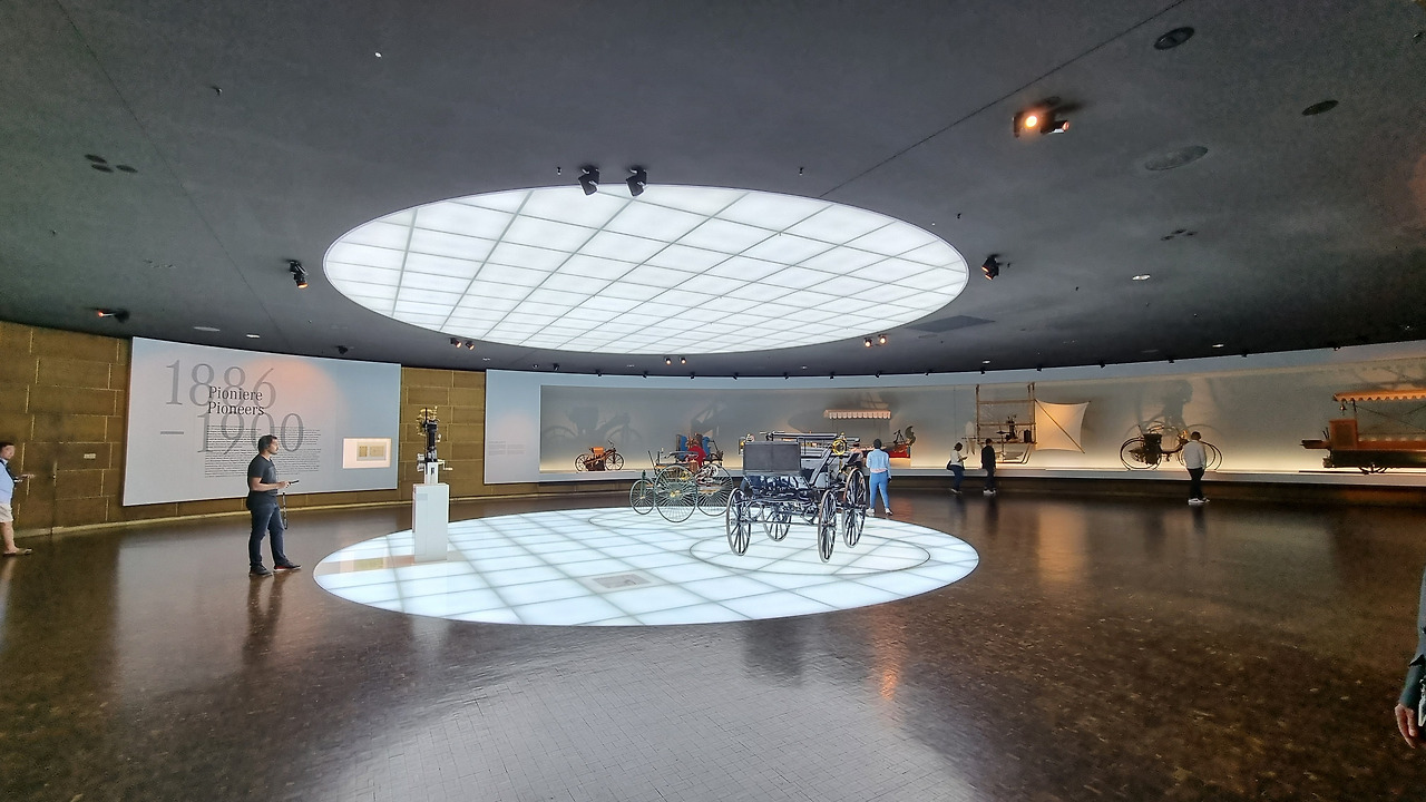 Pioneer, 자동차의 발명을 화두로 던지는 8층 공간에 처음 진입하면 메르세데스의 최초의 차와 엔진이 약 100평 규모의 공간 중앙에 전시되어 있다. 선택과 집중을 위해서 이 넓은 공간을 인위적으로 채우려 하지 않고, 단 2대의 차와 가솔린 엔진 한대만을 조명으로 하이라이트 하여 관람객의 시선을 유도하는 큐레이팅에 감탄하지 않을 수 없다. 차를 제자리에서 돌려 굳이 관람객이 돌지 않아도 가만히 서서 감상할 수 있게 해주는 섬세한 배려 역시 칭찬할만하다.
