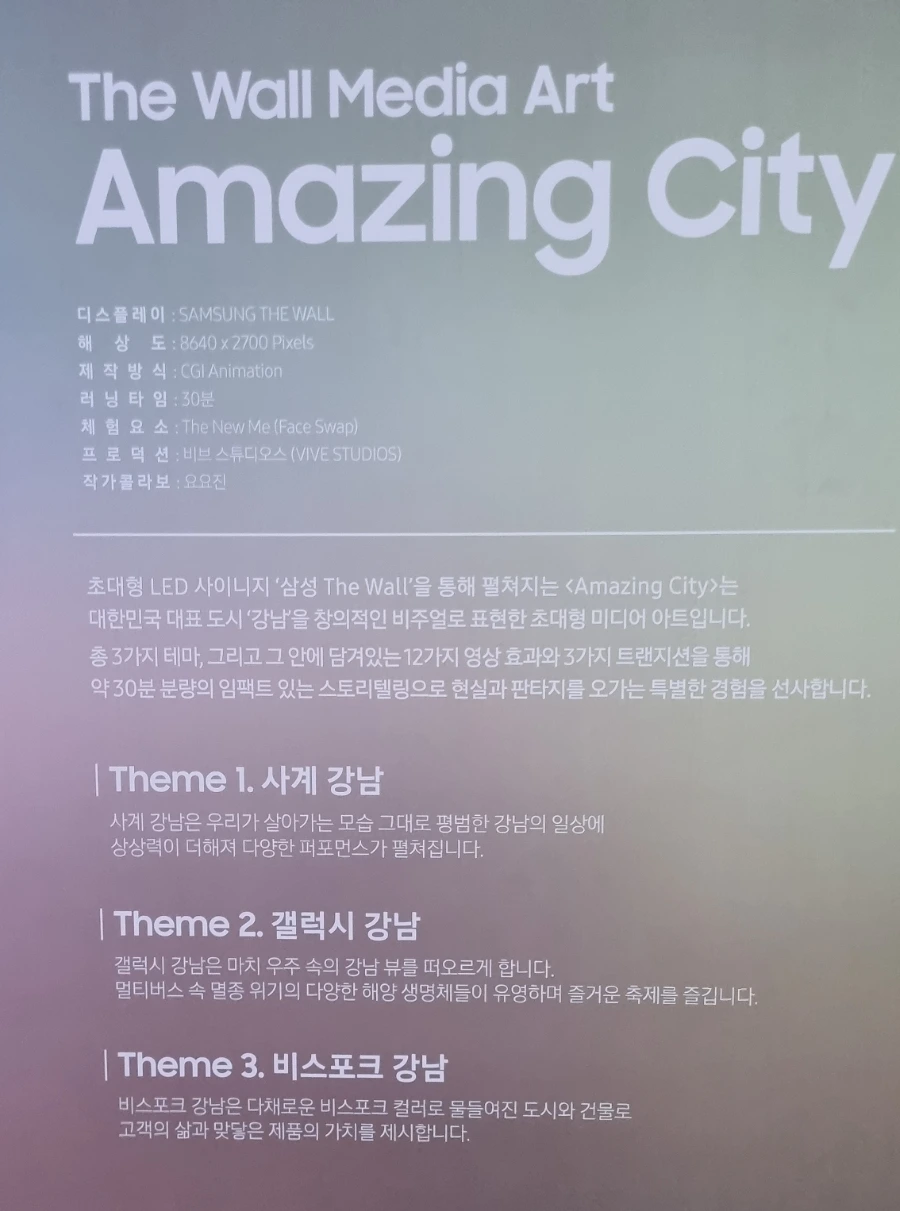현장에서 셀카를 찍으면 본인 얼굴이 미디어 아트 영상으로 구현되어 강남대로 옥외광고판에 투영되는 참여형 체험인데 이미 많은 전시회나 다른 브랜드들이 많이 쓰고 있어서 인지 딱히 새로움이나 흥미를 느끼지는 못했다.