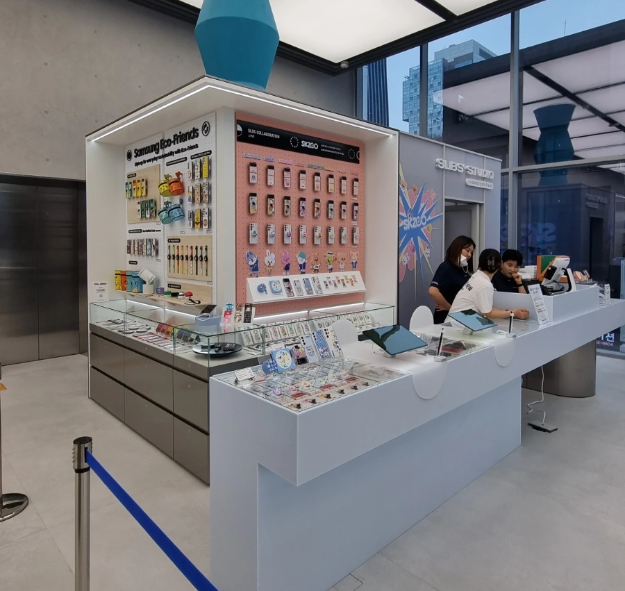 센터커피를 지나면 SLBS와의 협업을 통해 갤럭시 휴대폰 케이스를 여러 가지로 디자인해 볼 수 있는 공간이 준비되어 있고 재활용 소재 활용한 에코 프렌즈 제품도 구경할 수 있다.