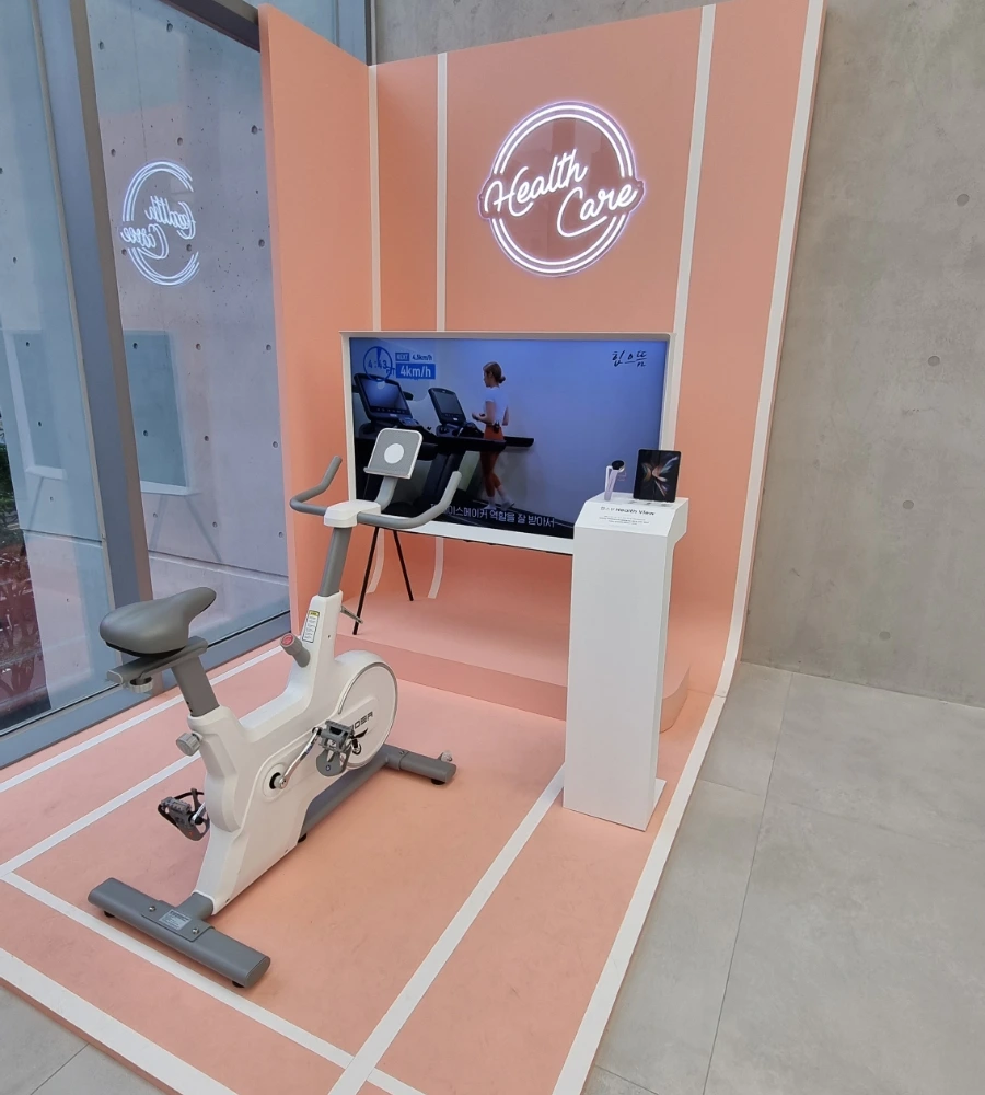 코너 끝 Health Cafe에서는 갤럭시 워치와 모니터를 연동해 Health View운동 체험이 가능하다. 시도는 좋은데 달랑 1대라는 점은 좀... 헬스장처럼 강남대로 창가로 자전거를 여러 대 배치하고 투명 oled를 활용해 시각적인 재미요소를 좀 더 주면 어땠을까? 하는 아쉬움이 크게 남는다.