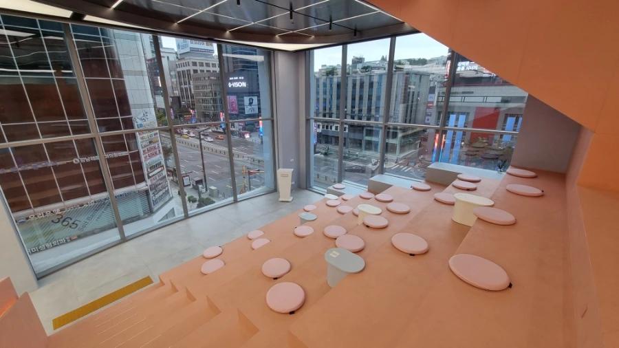 카페 옆의 계단식 휴게공간인 라운지에서는 정기적으로 다양한 클래스가 열린다고 하는데 아직 준비는 안된 것 같고, 일단은 강남대로를 내려다보며 멍 때리면서 쉬는 것도 나쁘지는 않아 보인다. 덤으로 휴대폰 무선충전도 가능하다. 사실 영리 기업들이 만드는 공간에 특히나 이런 비싼 강남 부동산에 이 정도 면적을 라운지로 조성한다는 건 쉬운 일이 아니다. 실무자 입장에서 "왜 라운지가 필요한지?" 설득에 설득을 통해 높으신 분들의 승인을 받아야 하기 때문이다. (어떻게든 많이 보여주는 게 능사는 아니다.)