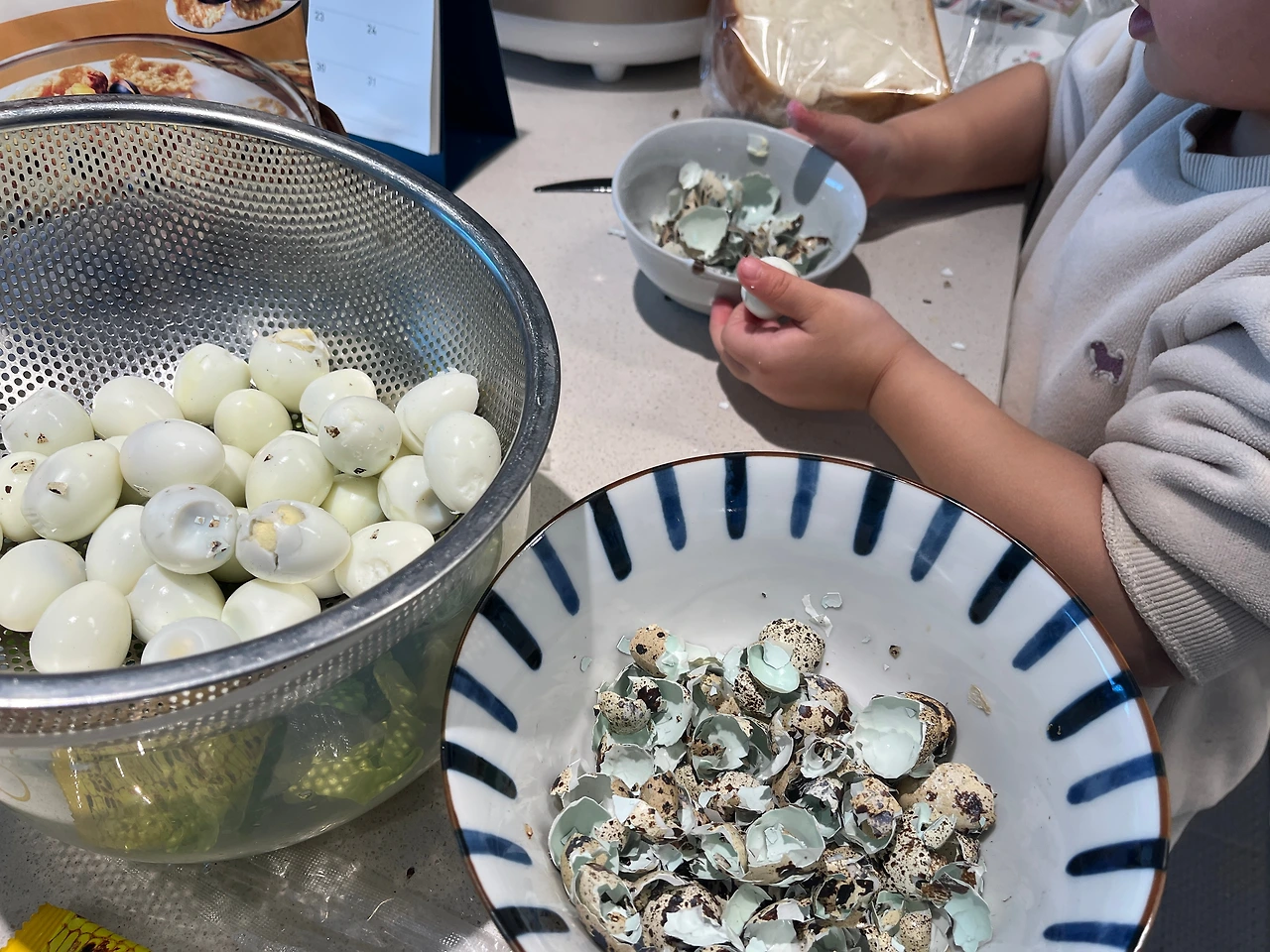 아이와 마주 앉아 메추리알을 깠다.