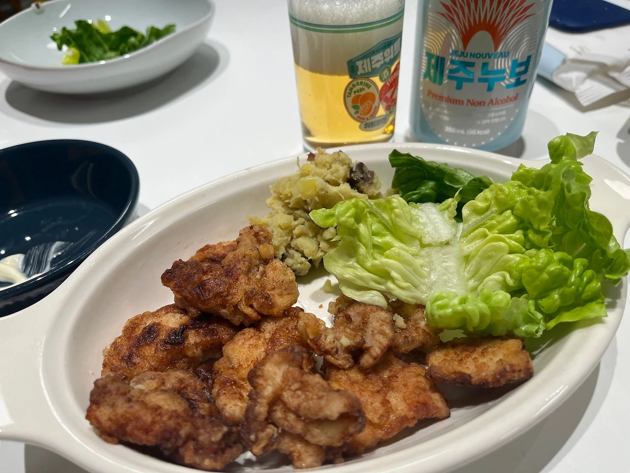가라아게, 고구마 샐러드, 그리고 맥주.