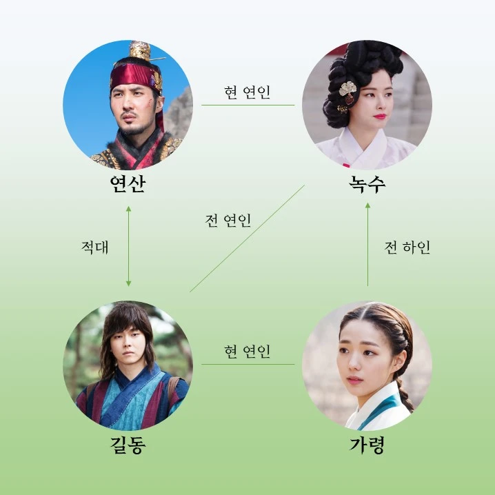 사실 그것을 먼저 알아본 이는 연산이 아니라 길동이다. 녹수가 공화이던 시절, 그리고 길동이 홍첨지가 아니라 방물장수이던 시절 둘은 옛 연인이었다. 그러나 잃어버린 기억을 찾기 위해 길동은 공화를 떠나고, 이후 공화는 궁에 들어가 이름을 녹수로 바꾸고 연산군의 눈에 들게 된다. 심지어 녹수라는 예명은 길동이 지어준 것이다(!) 길동-녹수-연산 사이의 삼각관계는 훗날 연산군이 더욱 폭주하게 되는 계기로 작용한다는 점에서 서사의 긴장감을 더해준다.