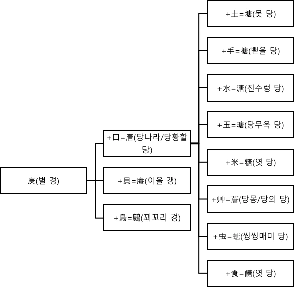 庚에서 唐(당나라/당황할 당)·賡(이을 갱)·鶊(꾀꼬리 경)이 파생되었고, 唐에서 塘(못 당)·搪(뻗을 당)·溏(진수렁 당)·瑭(당무옥 당)·糖(엿 당)·蓎(당몽/당의 당)·螗(씽씽매미 당)·餹(엿 당)이 파생되었다.