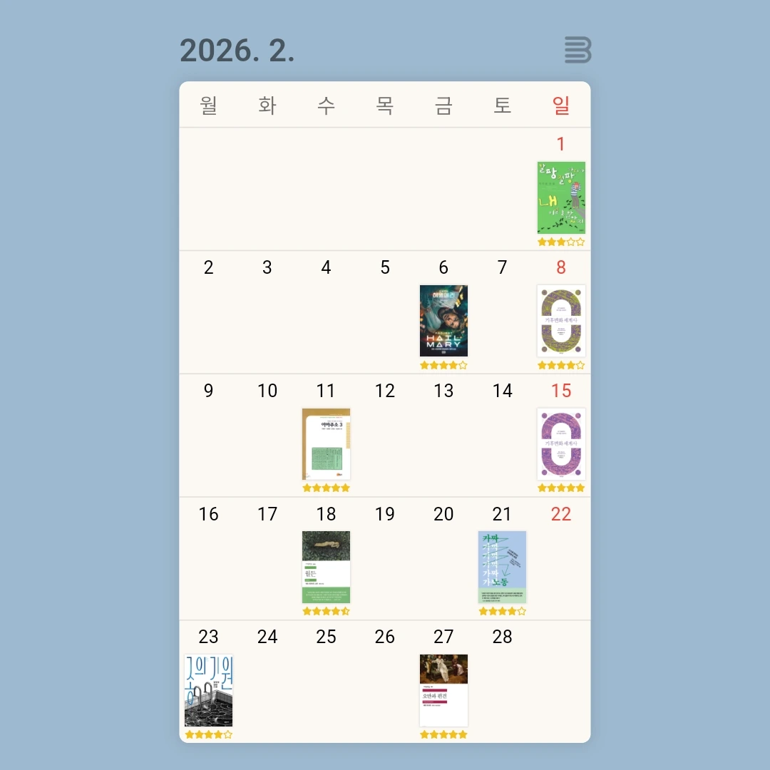 이번 달 독서 시간은 총 26시간 32분으로 여전히 하루 평균 1시간에는 못 미치지만 지난달보다는 늘었습니다. 지난달 읽은 책이 11권이었으니 권수는 줄었는데, 《기후변화 세계사》 시리즈와 《월든》이 긴 책이면서도 내용이 무거워서 시간을 많이 들였습니다. 장편소설이 많은 것도 한 요인이고요. 《프로젝트 헤일메리》는 아직 2월이지만 올해 읽은 책 중 가장 시간을 많이 쏟아부은 책입니다.