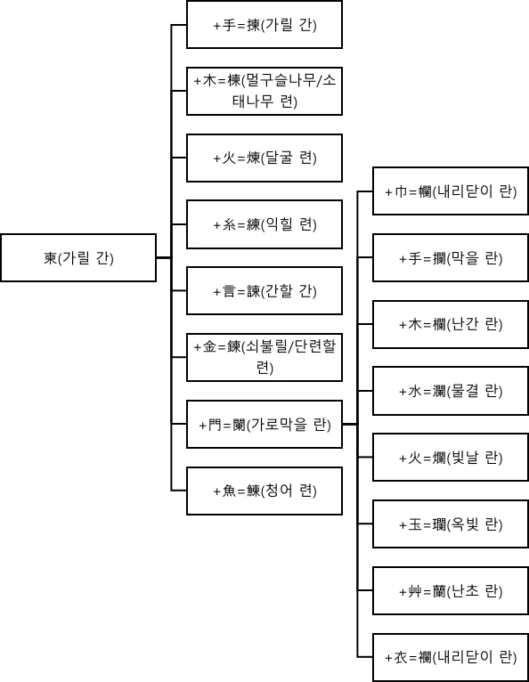 柬에서 揀(가릴 간)·楝(멀구슬나무/소태나무 련)·練(익힐 련)·諫(간할 간)·鍊(쇠불릴/단련할 련)·闌(가로막을 란)·鰊(청어 련)이 파생되었고, 闌에서 幱(내리닫이 란)·攔(막을 란)·欄(난간 란)·瀾(물결 란)·爛(빛날 란)·瓓(옥빛 란)·蘭(난초 란)·襴(내리닫이 란)이 파생되었다.