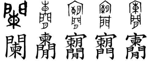 금문의 다양한 闌과 해서화. 출처: 小學堂기본 형태인 門과 柬이 합한 형태 외에, 閒(사이 간, 한가할 한)과 柬이 합한 형태도 있고, 여기에 柬 대신 宀(집 면)+束+月이 들어가기도 하는 등 복잡한 변화를 보인다.
