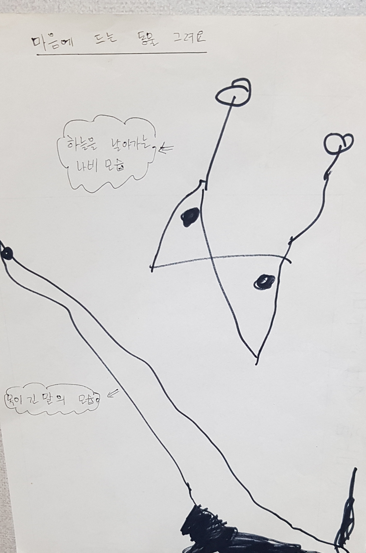 작은애가 나비를 보고 온 날 그린 나비. 나비를 그리다 빈 공간에 나비 친구로 키 큰 기린을 그림