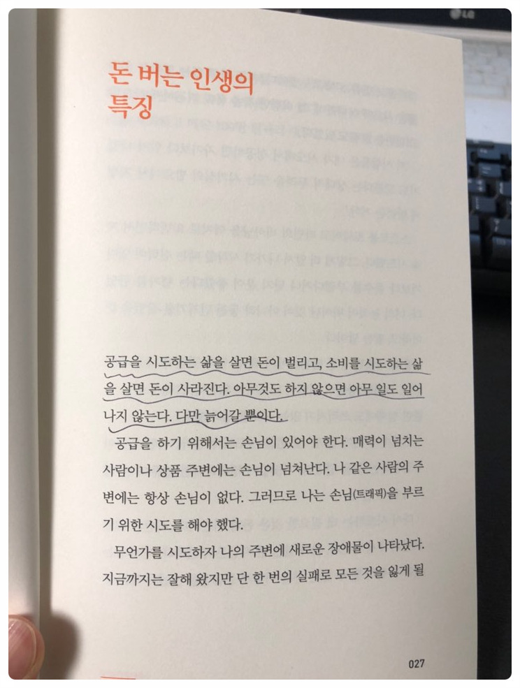 공급을 시도하는 삶을 살면 돈이 벌리고, 소비를 시도하는 삶을 살면 돈이 사라진다. 아무것도 하지 않으면 아무 일도 일어나지 않는다. 다만 늙어갈 뿐이다. p27