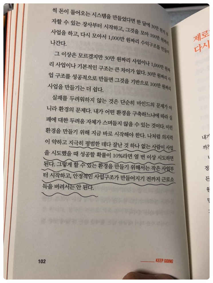 지극히 평범한 데다 잘난 것 하나 없는 사람이 사업을 시도했을 때 성공할 확률이 10%라면 열 번 이상 시도하면된다. 그렇게 할 수 있는 환경을 만들기 위해서는 작은 사업부터 시작하고, 안정적인 사업구조가 만들어지기 전까지는 근로소득을 버려서는 안된다. p102