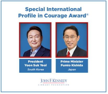 이 두 국가의 관계 회복을 미국이 얼마나 반기고 있는지를 알 수 있는 대목이 하나 있다. 바로, 존 F. 케네디 도서관 재단에서 올해 ‘케네디 특별 국제용기상’ 수상자로 윤석열 대통령과 기시다 총리를 선정한 것이다. 수상 이유는 다음과 같다.