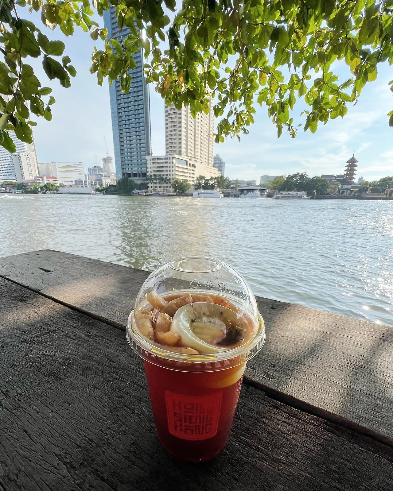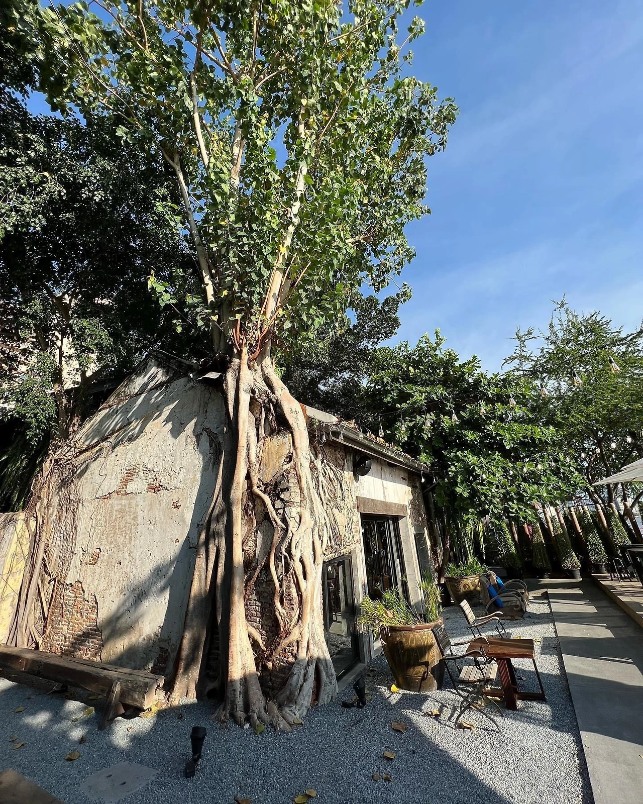 입구에서 보는 것과 달리 안쪽으로 들어오면 상당히 큰 카페로 차오프라야 강변 풍경을 즐길 수 있는 야외석과 몇 가지 섹션으로 나뉜 실내석들이 있습니다. 야외석에서 보면 앙코르와트의 ‘따 프롬’을 연상케 하는 건물과 함께 자란 나무도 볼 수 있습니다.