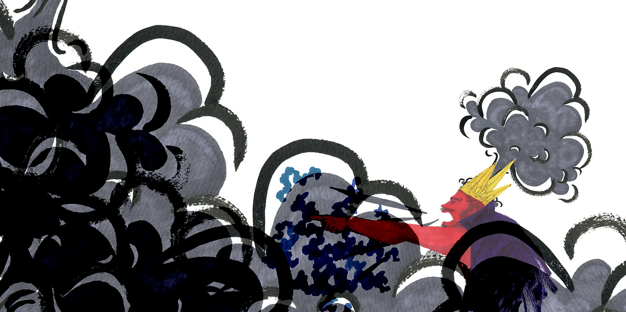 왕은 큰소리와 무서운 표정을 지으며 손짓했다.