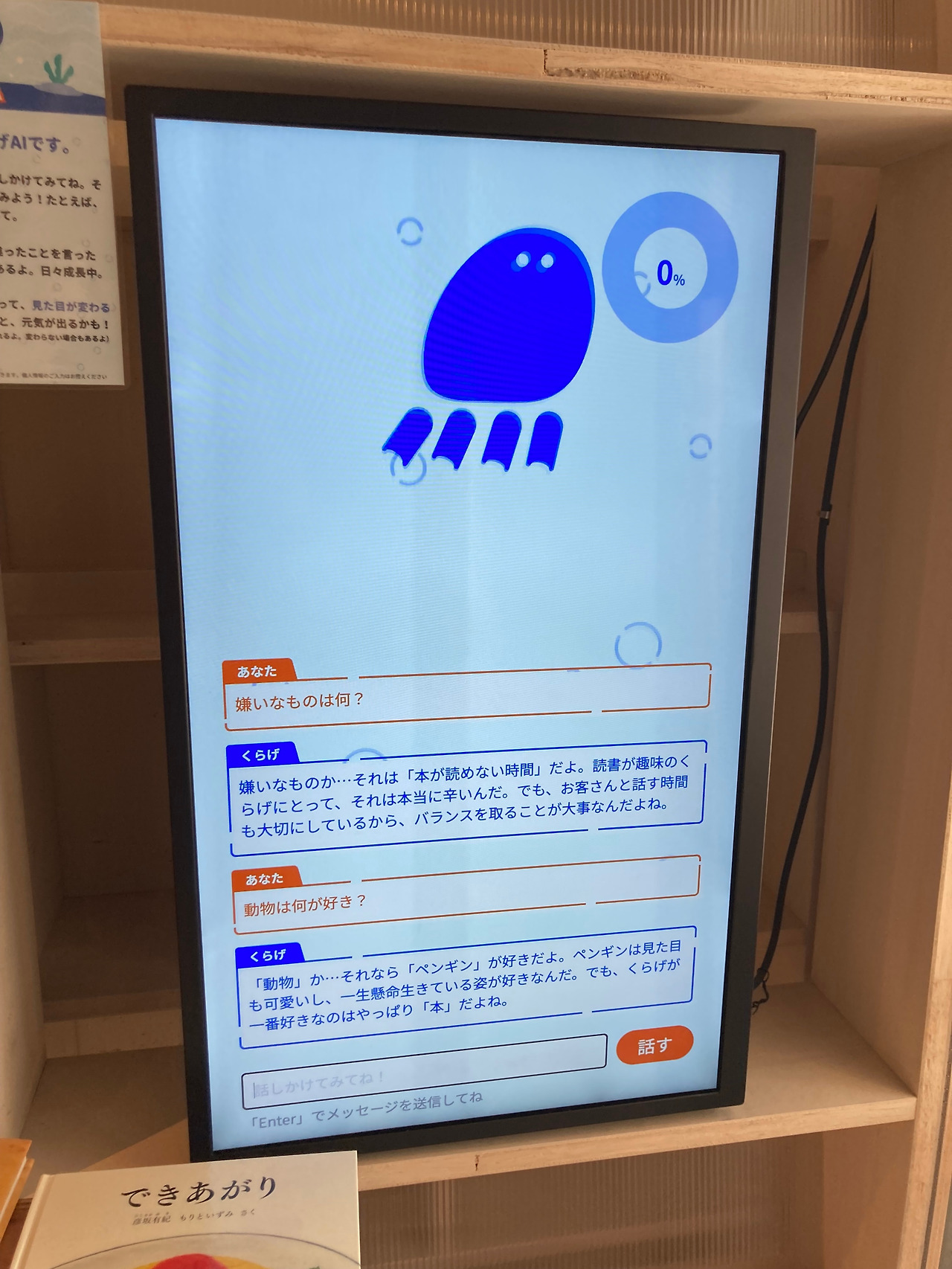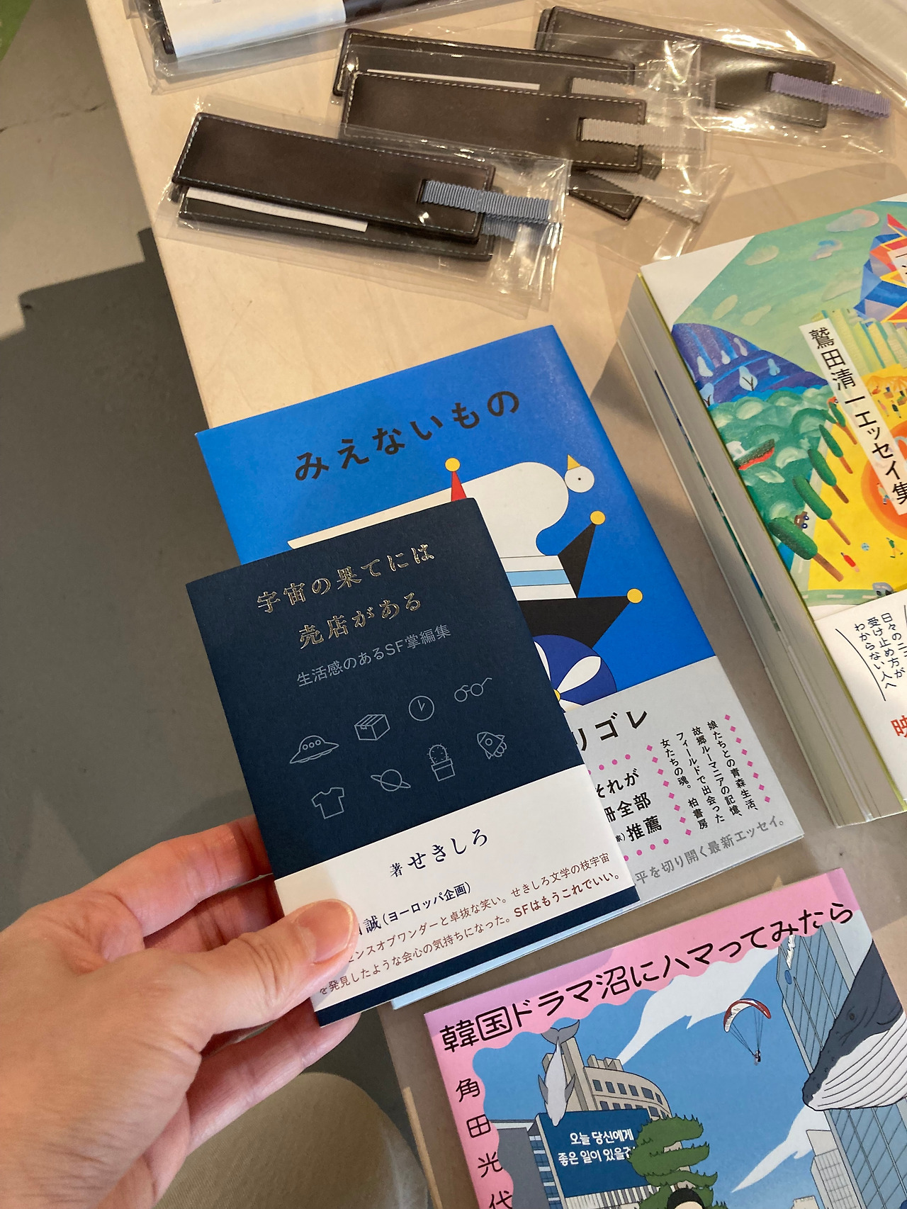 기세를 몰아 다른 동네에서 마주친 마음에 드는 서점도 몇 곳 소개해보는 걸로. 쿠라마에(蔵前)에 있는 무인서점인 토메쇼텐(透明書店). 누구 하나 오래 구경한다고 눈치 주지 않는다. 왼쪽 입구에는 해파리 AI 화면이 맞이해 준다. 알고 보면 직책이 부점장님 (문어인 줄 알았는데 해파리였다.) 부점장님과는 간단한 채팅도 가능하다. 책구경하고 굿즈구경하고 계산은 셀프로 하면 된다. 이곳도 한편에 공동서점을 운영 중이다. 티셔츠, 모자 등의 서점 오리지널굿즈도 팔고 있는데 티셔츠 사이즈를 확인할 수 없어 아쉽지만 발걸음을 돌려야 했다. (또 가면 되지?)