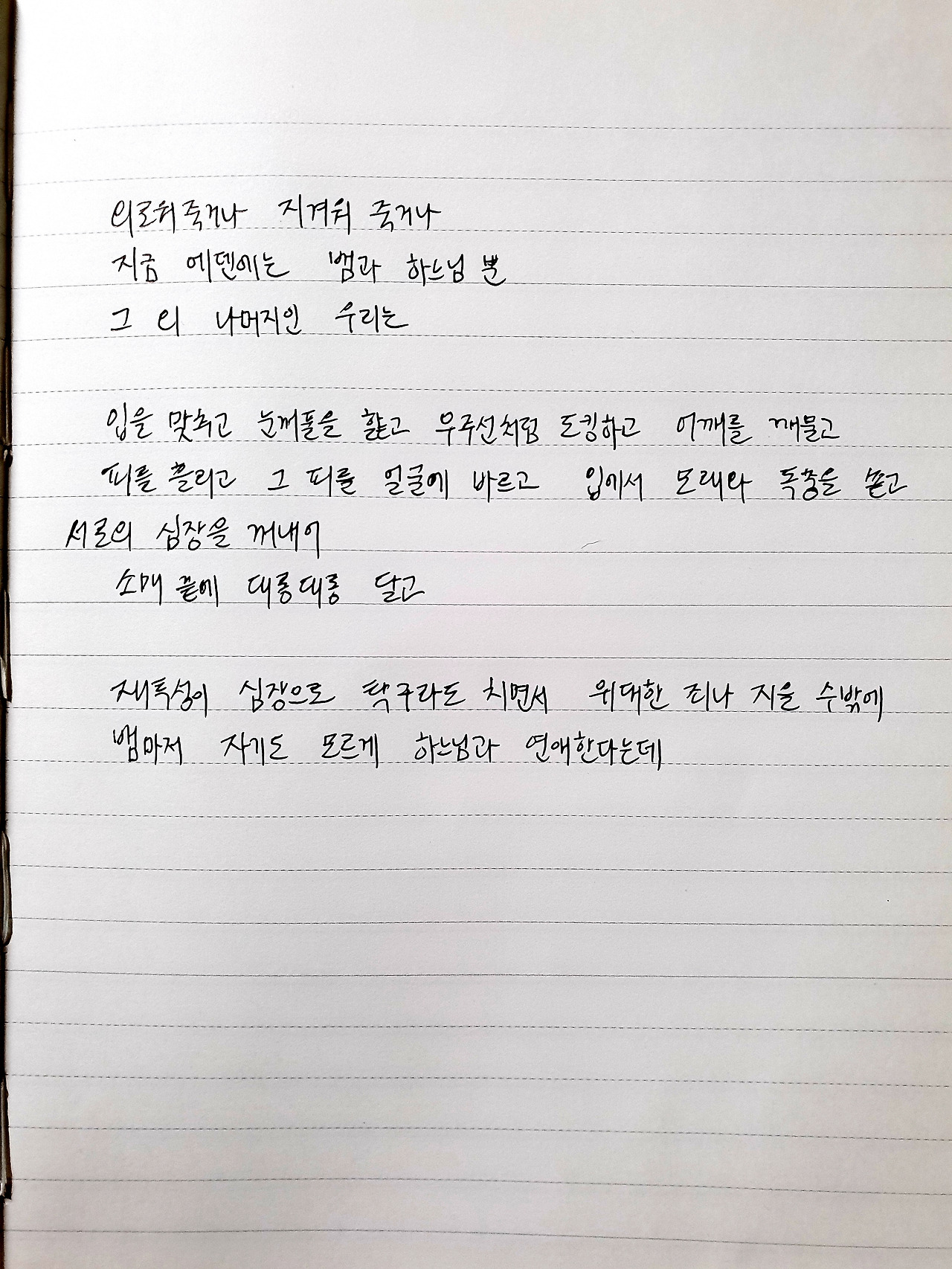 시인은 '미친 사랑'을 해본 것 같다. 아름답고 지독한 사랑. "시각을 모르고 위도와 경도를 모르고 입을 맞추고 눈꺼풀을 핥고 우주선처럼 도킹하고 어깨를 깨물고 피를 흘리고 그 피를 얼굴에 바르고 입에서 모래와 독충을 쏟고 서로의 심장을 꺼내어 소매 끝에 대롱대롱 달고".